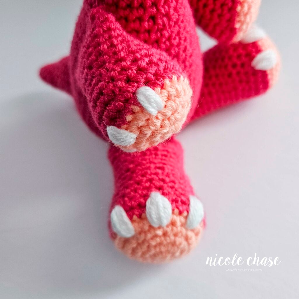 Using color C (shown as white) embroider 3 nails on each leg, over R5-7, leaving about 2 sts between each nail.